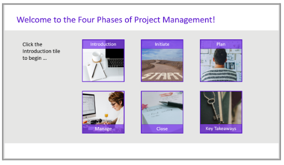 VoiceoverWelcome to the Four Phases of Project Management.This eLearning course will take approximately XX minutes to complete.This training will enhance your understanding of the four phases project management and how applying them can lead to more successful project outcomes.  This course will include an introduction, followed by the four phases–initiate, plan, manage, and close–and some key takeaways to help you begin to apply these concepts to your next project.Click the Introduction tile to begin.