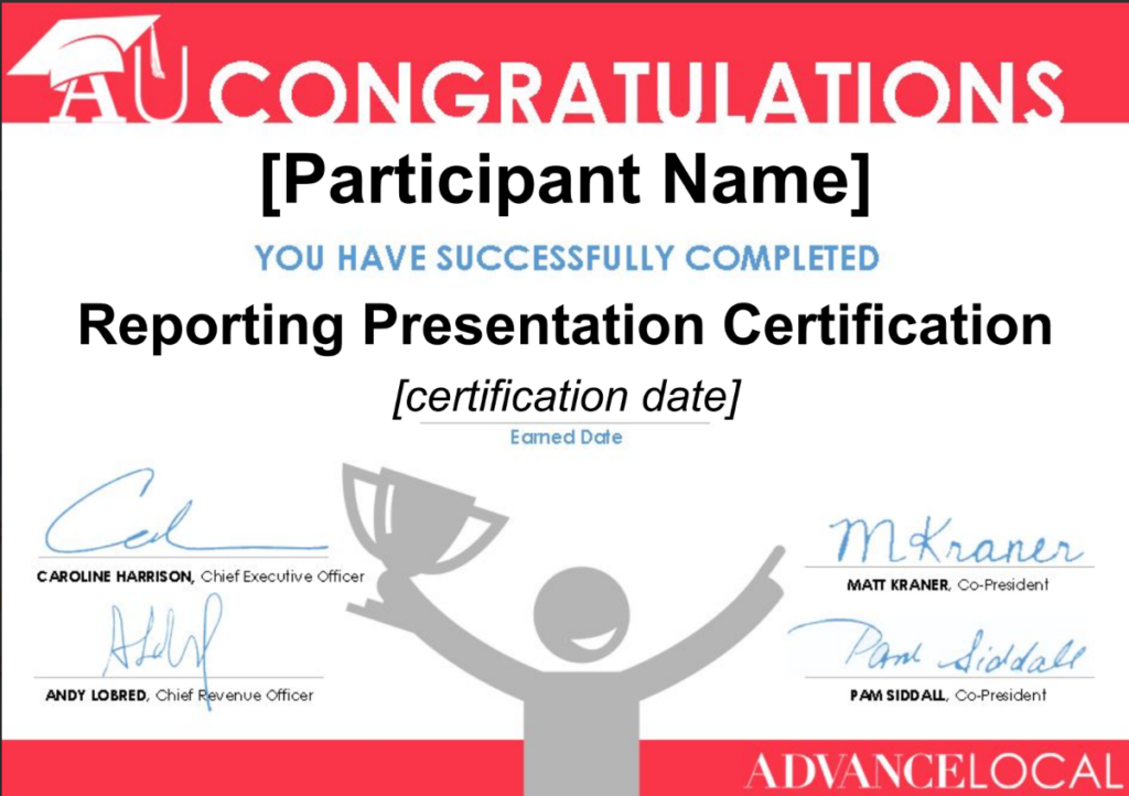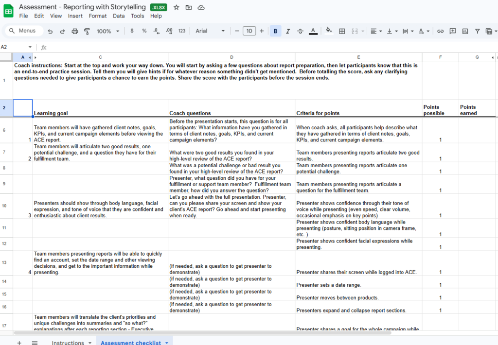 I prepared sales and operations managers as “certification coaches” which enabled us to quickly certify all participants. I provided all participants including coaches with this document to help them prepare. Each 3-person team of sales and ops participants were given a client from another market, from whose reporting dashboard they would present in a role-play style certification. Sellers led the presentation, supported in specific ways by ops team members.