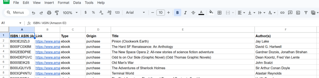 This is a job for generative AI – specifically ChatGPT (version 5.2 in Thinking mode), I thought. But how do I get ChatGPT to look at my Kindle book list? So I went back to my Kindle Library and did a CTRL-A to select all text on the page, and pasted that into a Google Doc, then uploaded it into ChatGPT, asking first for the document to be cleaned up in a few specific ways.